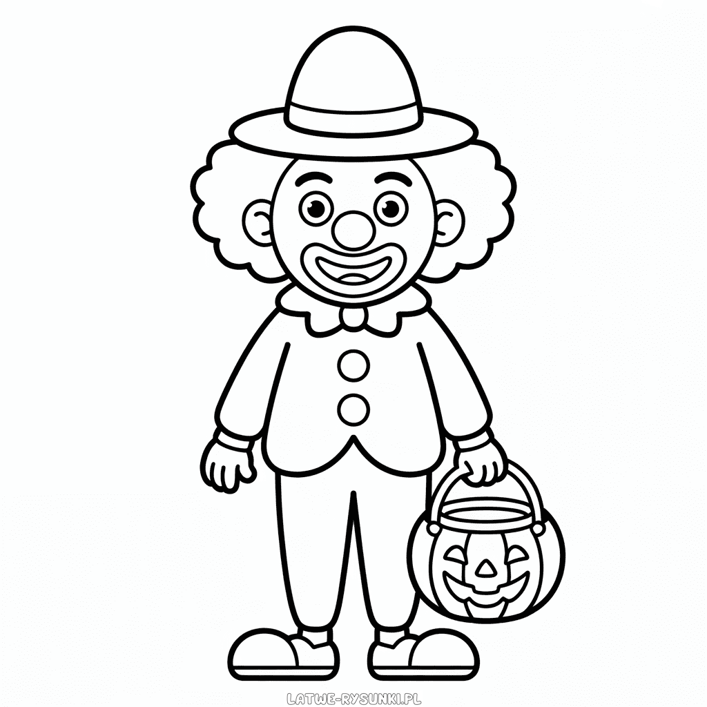 Prosty rysunek Klaun na Halloween do pobrania za darmo, przedstawiający zabawnego klauna gotowego na święto Halloween. Kolorowanka do odrysowania lub pokolorowania dla dzieci. Wysokiej jakości szablon w czerni i bieli, zoptymalizowany do druku w formacie PDF A4.