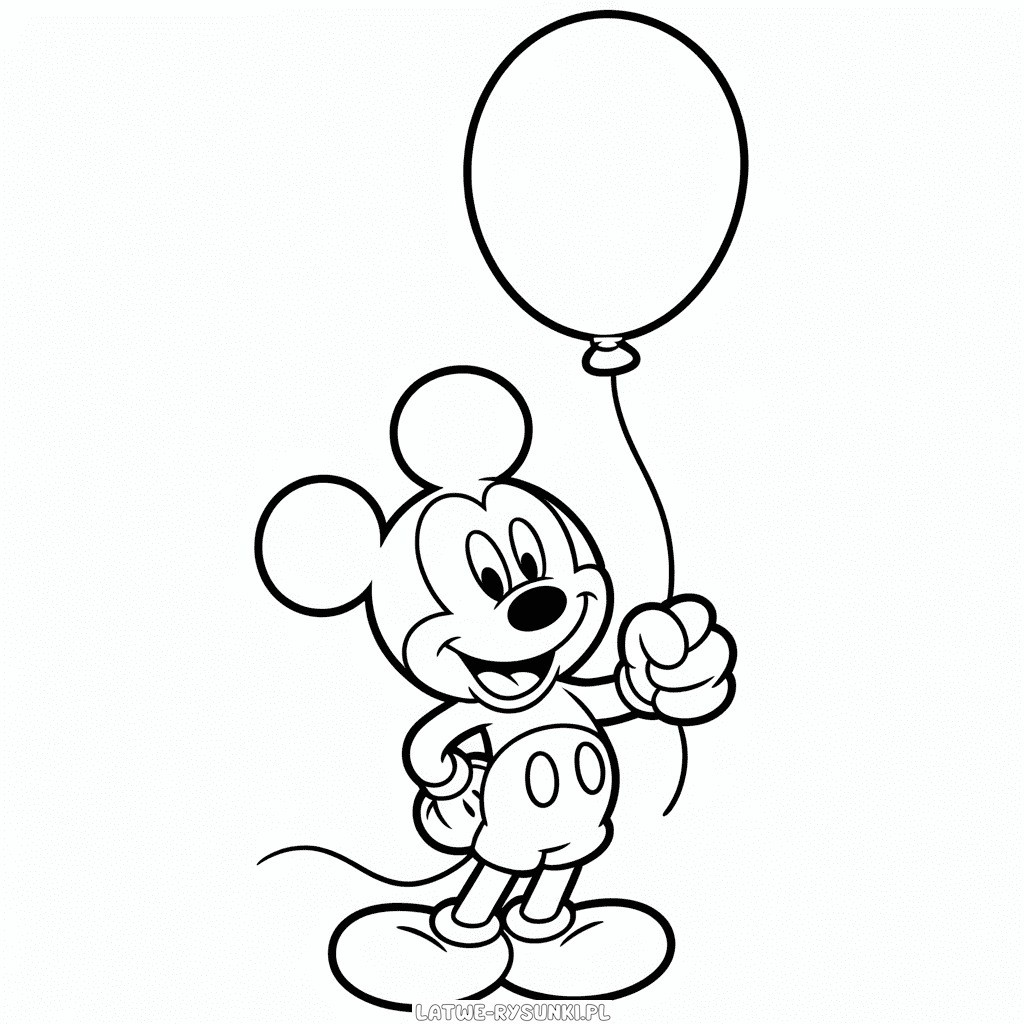 Prosty rysunek Myszka Miki trzymający balon do pobrania za darmo, idealny dla miłośników klasycznych postaci Disneya. Kolorowanka do odrysowania lub pokolorowania dla dzieci. Wysokiej jakości szablon w czerni i bieli, zoptymalizowany do druku w formacie PDF A4.